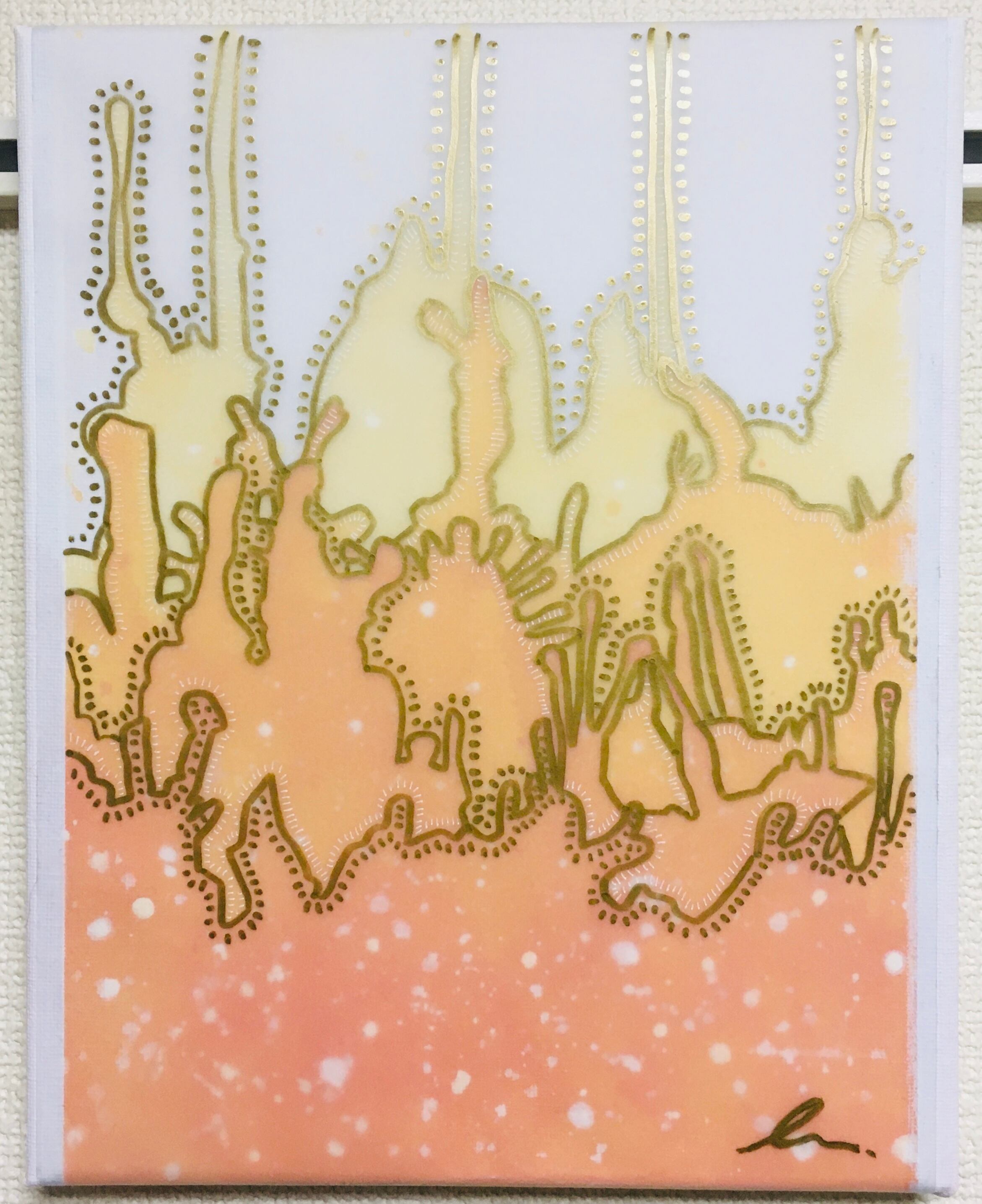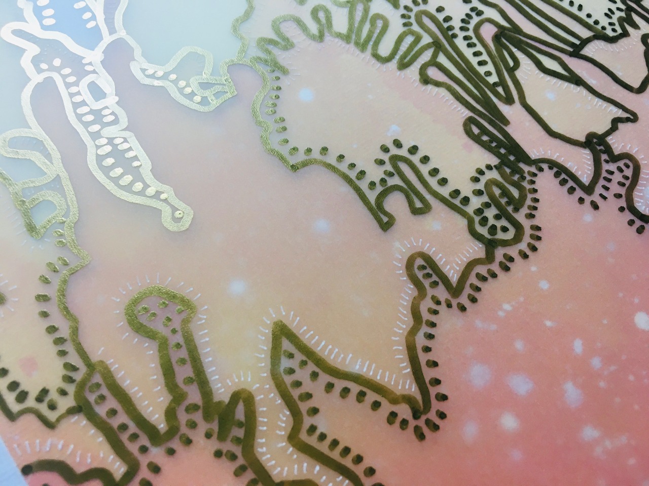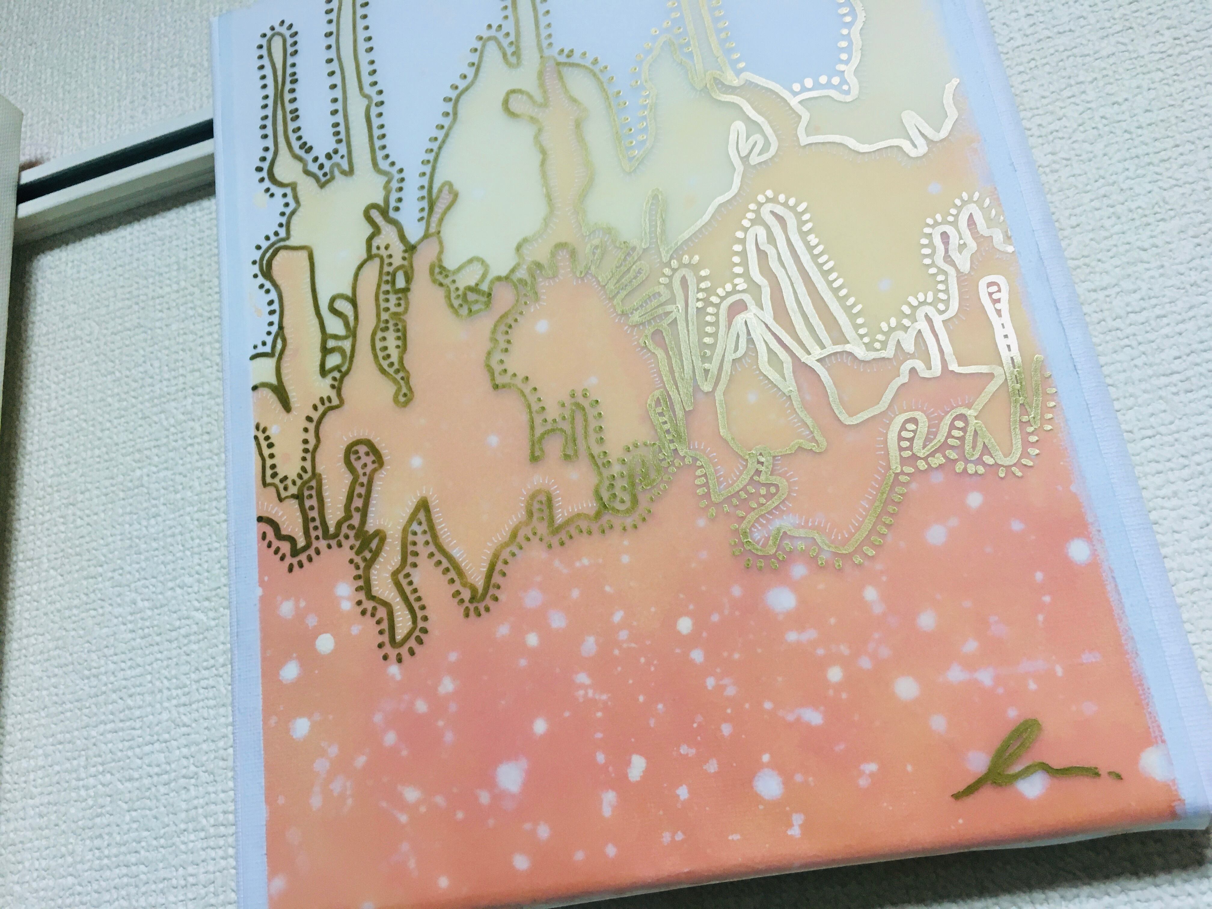 アクリルアートの上にトレーシングペーパーを重ねゴールド油性と、ホワイトボールペンでポップに仕上げました。